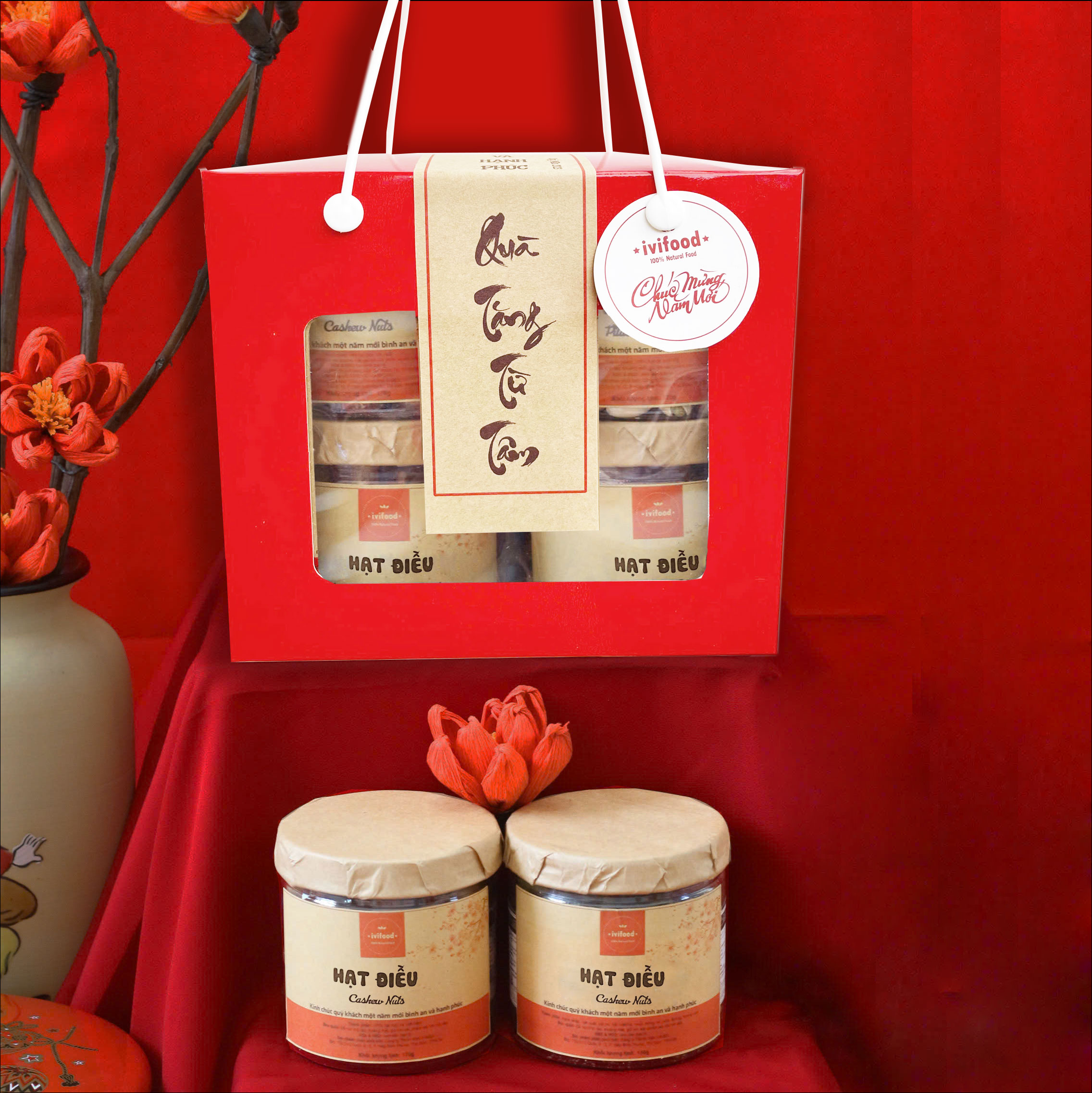 • Bao bì:  4 hủ hạt điều trong 1 hộp quà + Câu chúc Tết (khách có thể